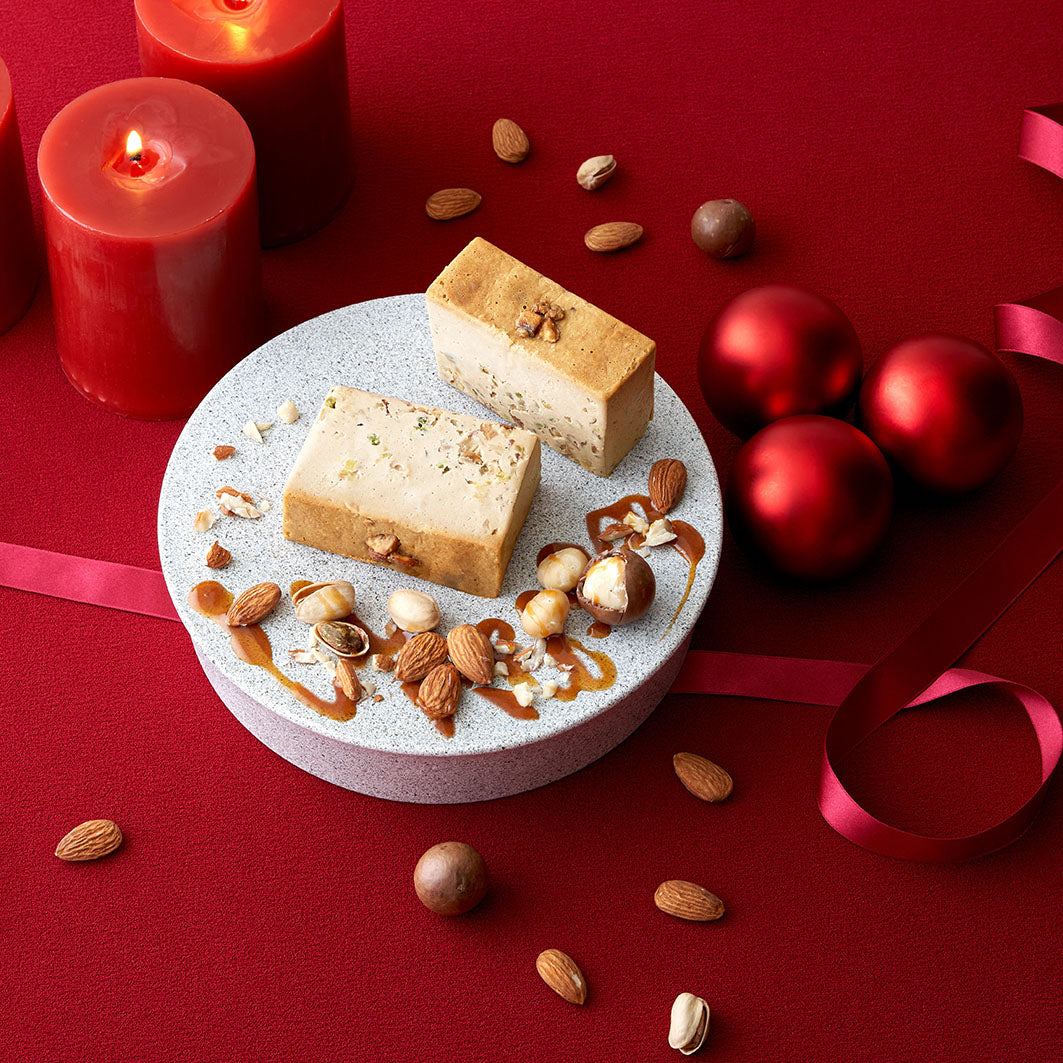 キャラメルペーストの程よい甘味とテリーヌのナッツとキャラメリゼされた塩ナッツとのハーモニーをお楽しみください。